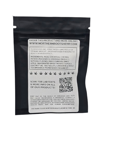 Ingredients: Peas, Chickpeas, Chicken, Potato, Pea Starch, Dried Egg Product, Natural Flavors, Dried Pumpkin, Dried Apple, Dehydrated Sweet Potato, Tapioca, Coconut Oil, CBD Isolate, Cinnamon, and Mixed Tocopherols (to preserve freshness).
